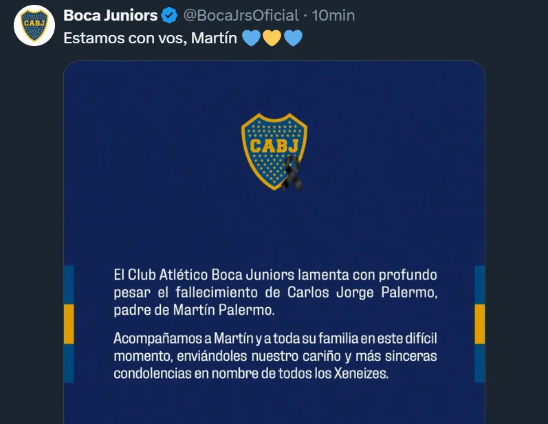 Así como se pusieron a disposición desde la institución en la que se desempeña el Titán, el mensaje de Boca no tardó en llegar: “El Club Atlético Boca Juniors lamenta con profundo pesar el fallecimiento de Carlos Jorge Palermo, padre de Martín Palermo. Acompañamos a Martín y a toda su familia en este difícil momento, enviándoles nuestro cariño y más sinceras condolencias en nombre de todos los Xeneizes”.
