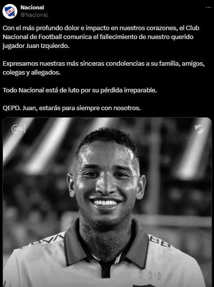 “Con el más profundo dolor e impacto en nuestros corazones, el Club Nacional de Football comunica el fallecimiento de nuestro querido jugador Juan Izquierdo. Expresamos nuestras más sinceras condolencias a su familia, amigos, colegas y allegados. Todo Nacional está de luto por su pérdida irreparable. QEPD. Juan, estarás para siempre con nosotros“, anunció Nacional en sus redes.