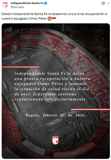 Temprano este jueves, la insitución de Bogotá dónde ganó 9 títulos, incluyendo una Copa Sudamericana, informó sobre el problema de saluda del exfutbolista: “Independiente Santa Fe le desea una pronta recuperación a nuestro exjugador Omar Pérez y lamenta la situación de salud vivida el día de ayer. Esperamos continúe evolucionando satisfactoriamente”,