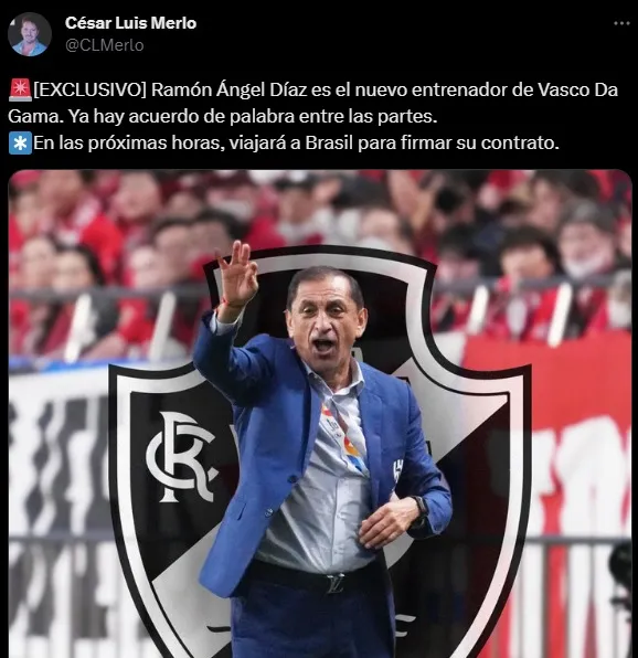 Último en el Brasileirao, Vasco Da Gama habría encontrado en Ramón Díaz una posible solución a sus problemas y por esto le ofreció el mandato del equipo al DT argentino quién, según la información de César Luís Merlo, viajará a Brasil entre este martes y miércoles.