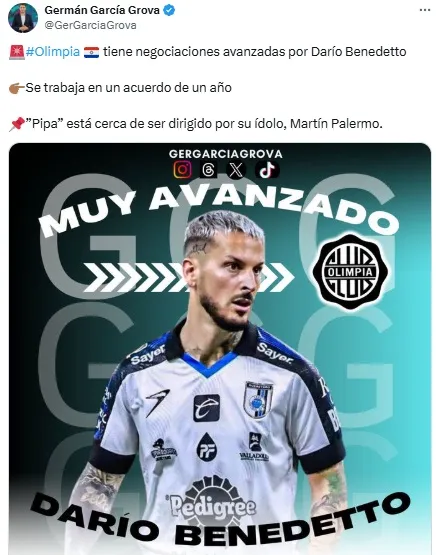 Según la información de Germán García Grova, Benedetto tiene negociaciones avanzadas para convertirse en el nuevo delantero de Olimpia. El conjunto paraguayo está clasificado para la fase de grupos de la Copa Libertadores 2025 y apostaría a la experiencia del Pipa para sumar jerarquía.