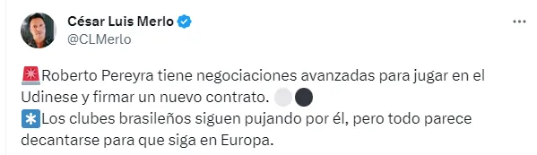 Si bien también tuvo sondeos del Inter de Porto Alegre, el volante argentino tiene el deseo de seguir en el fútbol europeo, y tal lo informado por el periodista Cesar Luis Merlo, tiene negociaciones avanzadas para jugar en el Udinese y firmar un nuevo contrato.