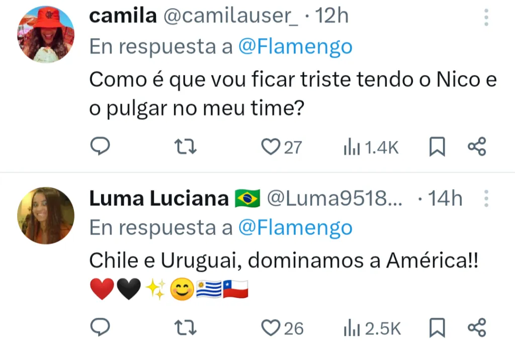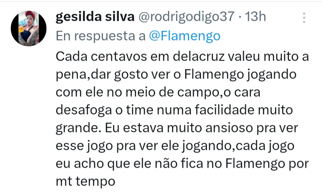 “Cada centavo gastado en De La Cruz valió la pena. Es un placer ver a Flamengo jugar con él en el mediocampo. Releva al equipo con mucha facilidad. Tenía muchas ganas de ver este partido. Creo que no se quedará mucho tiempo en Flamengo”, escribió un hincha como respuesta a una foto del uruguayo publicada en la cuenta de X oficial del club.