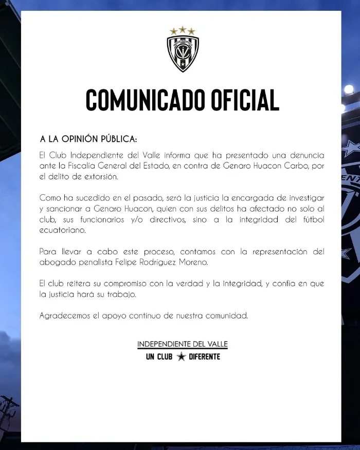 “Se rechaza rotundamente las acciones y declaraciones de Genaro Huacón, personaje conocido entre los actores del fútbol ecuatoriano por su continuo accionar delictivo, quien en los últimos meses ha buscado obtener provecho personal a través de, como el mismo lo llama, ‘vender su silencio’; y en las últimas horas, coincidentemente en el momento en que se juega la definición de la primera etapa del torneo, ha buscado afectar la honra de IDV en medios de comunicación que, lamentablemente, se han prestado para amplificar los ataques de un delincuente confeso y sentenciado”, dice el texto difundido por canales oficiales del club.