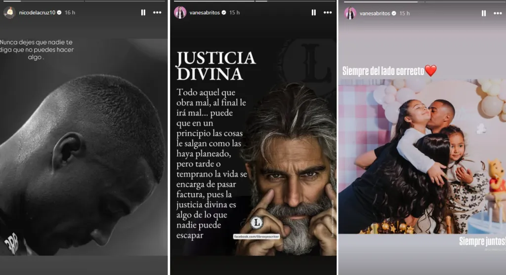 Luego llegó el turno de Vanesa Britos, esposa del uruguayo, quien compartió una foto en familia y escribió: “Siempre del lado correcto. ¡Siempre juntos!“. En la siguiente historia, publicó otro texto: “Todo aquel que obra mal, al final le irá mal… puede que en un principio las cosas le salgan como las haya planeado, pero tarde o temprano la vida se encarga de pasar factura, pues la justicia divina es algo de lo que nadie puede escapar”.