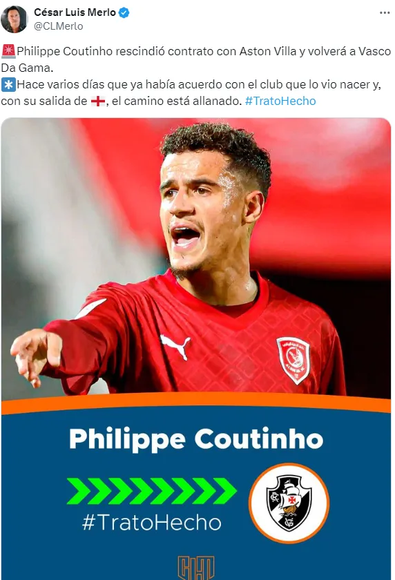 El delantero brasileño, que supo brillar en clubes de la talla de Liverpool, Barcelona y Bayern Múnich, rescindió su actual vínculo con Aston Villa al volver del préstamo en Qatar y tiene todo listo para volver a Vasco da Gama tras 14 años.