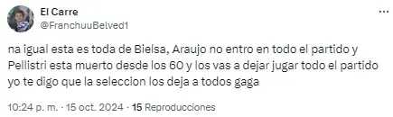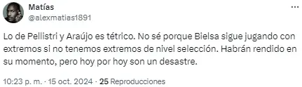Otro, en cambio, lanzó un dardo para algunos jugadores elegidos por Bielsa: “Lo de Pellistri y Araújo es tétrico. No sé por qué Bielsa sigue jugando con extremos si no tenemos extremos con nivel de selección. Habrán rendido en su momento, pero hoy por hoy son un desastre“.