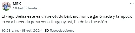 El combinado charrúa llegaba a esta décima jornada tras la derrota ante Perú en Lima, que incrementó las especulaciones sobre la relación entre los futbolistas y el entrenador. Aunque Uruguay mostró otra cara este martes, los hinchas en redes sociales fueron críticos con el Loco.
