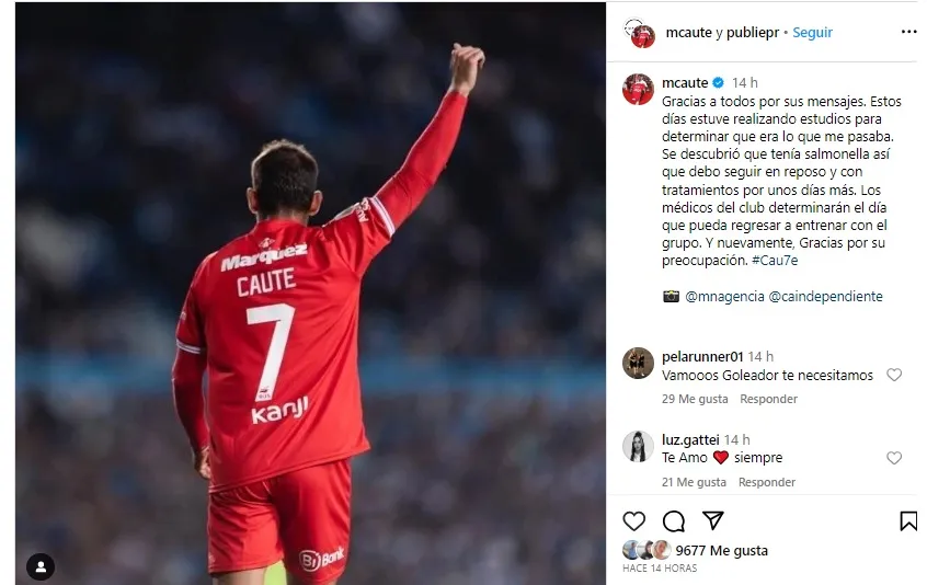Tras una semana con mucha incógnita en el todo Independiente por la salud de Martín Cauteruccio y su repentina baja, el delantero aclaró el panorama y reveló mediante un posteo en redes sociales cuál es la enfermedad que padece y que lo dejará fuera del próximo partido.