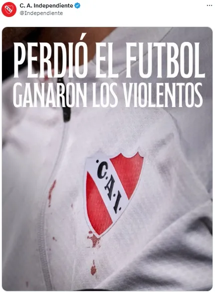 En ese contexto, el fallo generó malestar entre los dirigentes de Independiente y fue a través de una publicación en sus redes sociales dónde se descargaron en contra de la decisión de CONMEBOL. “Perdió el fútbol. Ganaron los violentos”, dice la imagen posteada por el Rojo.
