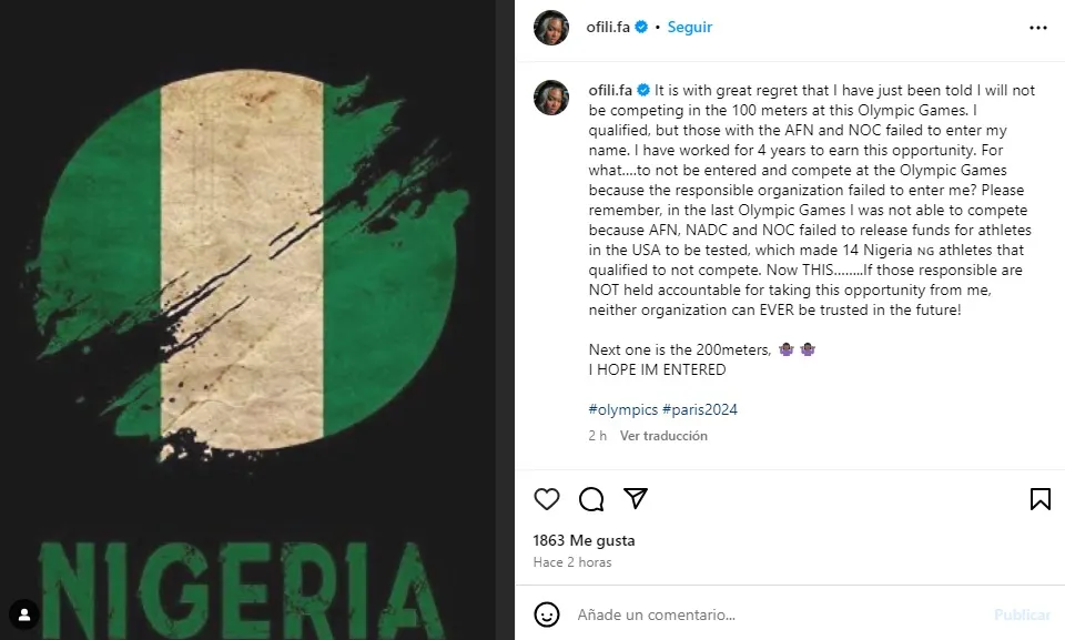 “Recuerden que en los últimos Juegos Olímpicos no pude competir porque FAN, CNAD y CON no liberaron fondos para que los atletas en los EE. UU. fueran examinados, lo que hizo que 14 atletas de Nigeria no calificaran para competir. Ahora esto… Si las organizaciones no se hacen responsables de quitarme esta oportunidad, ¡Nunca se podrá confiar en ninguna de las organizaciones en el futuro!”.