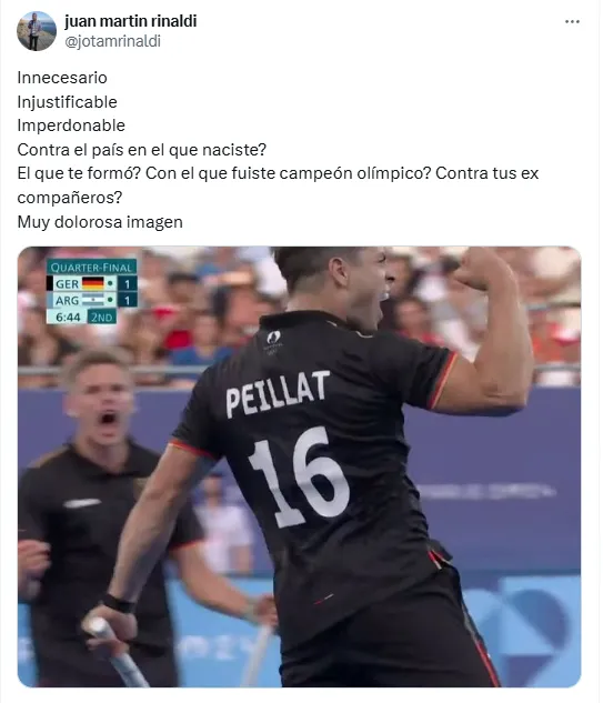 Entre réplicas irreproducibles e insultos de toda especie, el reconocido periodista Juan Martín Rinaldi destacó con su opinión sobre el festejo de Peillat y no tuvo piedad: “Innecesario. Injustificable. Imperdonable. ¿Contra el país en el que naciste? Muy dolorosa imagen”, fueron las palabras del exjugador de la Selección Argentina de Handball.