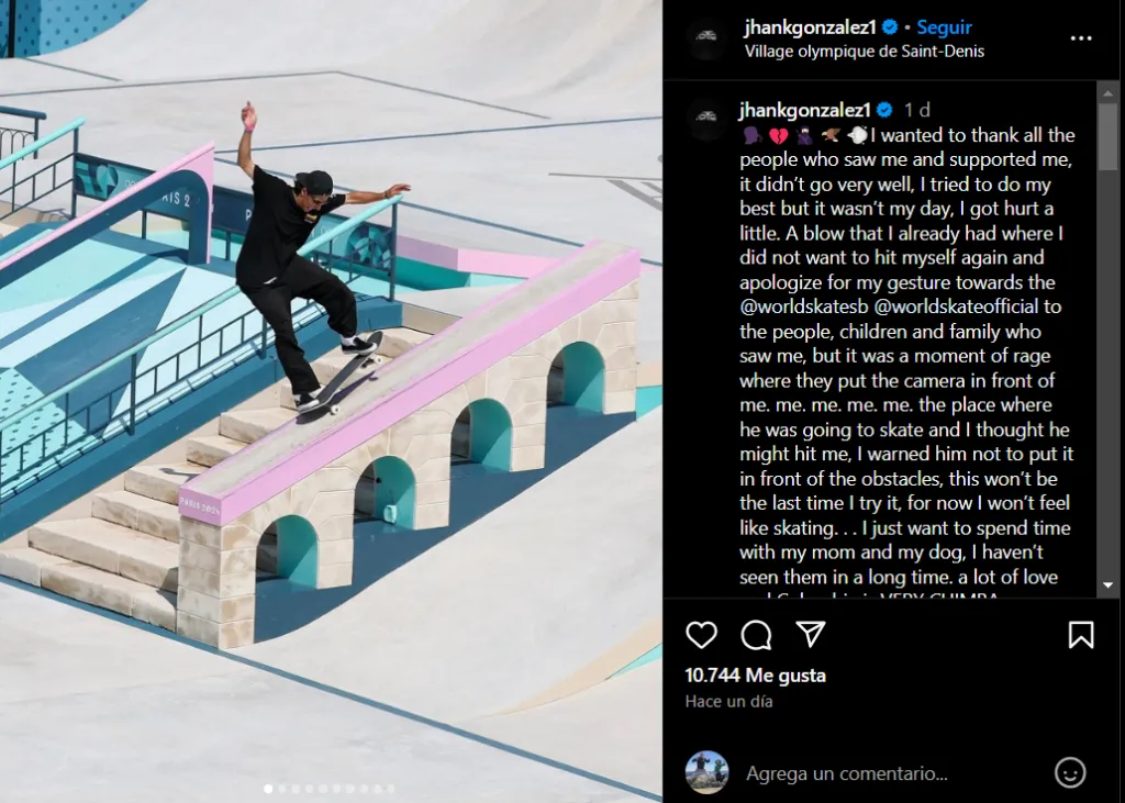 “Me gustaría pedir disculpas por mi gesto a la Federación Mundial de Skateboarding y a las personas, niños y familias que me vieron, pero fue un momento de rabia. Me pusieron la cámara delante, en el sitio en el que iba a patinar. Pensé que me podía golpear, lo advertí de que no pusiera la cámara delante de los obstáculos”, indicó.