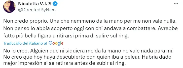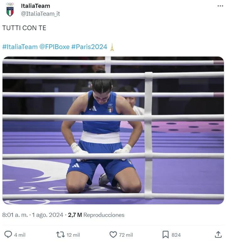 La cuenta @ItaliaTeam_it compartió una imagen de Angela Carini tras abandonar y lo acompañó con un cálido mensaje de apoyo: “Todos con vos”. Pero los comentarios de dicha publicación tuvieron mensajes dispares. En su gran mayoría eran de bronca por lo sucedido, en esos se destacaba la injusticia de haber aceptado pelear en esas condiciones. En menor medida había mensajes de apoyo a la deportista que decidió subir al ring sabiendo cómo eran las condiciones.