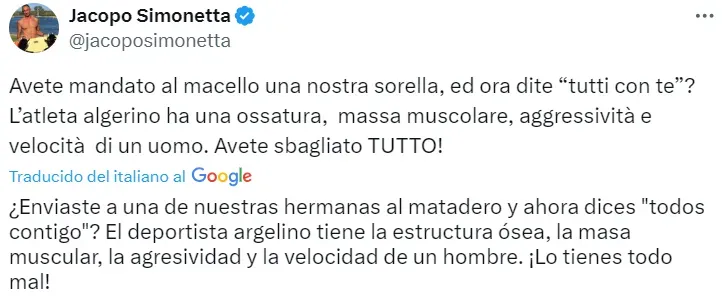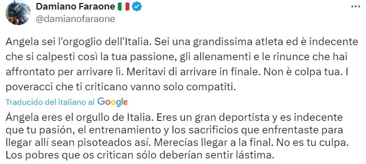 La presidenta de Italia suele tener posturas extremistas en lo que respecta a cuestiones de género. En esta oportunidad, la máxima mandataria italiana se manifestó respecto a la pelea entre Carini y Khelif: “No estaba de acuerdo con la elección de 2021 cuando el COI cambió el reglamento sobre este tema, no estoy de acuerdo hoy. Agradezco a Ángela por cómo luchó. Lamento que se haya retirado. Me emocioné cuando escribió: “Voy a luchar” porque en estas cosas lo que cuenta es la cabeza y la dedicación, pero también cuenta poder competir en igualdad de condiciones. Y esto no fue un desafío. en igualdad de condiciones no discriminar, discriminar”.