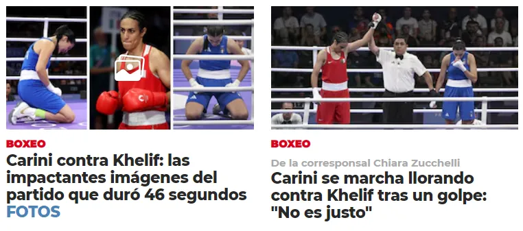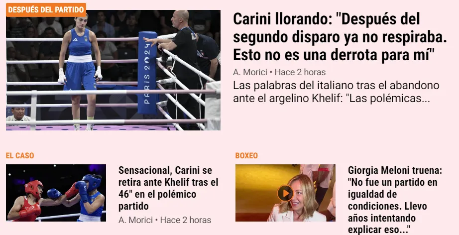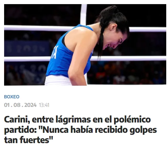 Distintos medios italianos también se hicieron eco de lo acontecido entre Carini y Khelif. Corriere dello Sport focalizó en las lágrimas de la italiana y en la declaración en que afirmó que no fue una pelea justa. En La Gazzetta dello Sport la línea fue similar, aunque sumaron que para Carini no fue una derrota, además de declaraciones de Giorgia Meloni sobre el tema. Tuttosport no se movió de la misma sintonía y puso sobre la mesa las lágrimas de la boxeadora de su país y la declaración en la que ella afirmaba nunca haber recibido golpes tan fuertes en su vida.