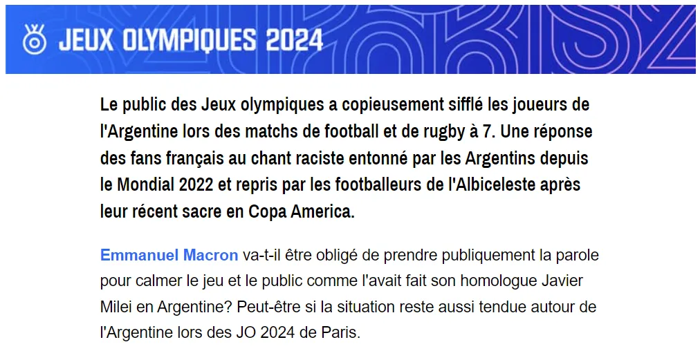 Dichos periódicos le dieron visibilidad al clima hostil contra Argentina. De hecho, el medio ‘RMC Sport’ le pidió a Emmanuel Macron, presidente de Francia, que tome cartas en el asunto para poder calmar esta situación y que no pase a mayores.