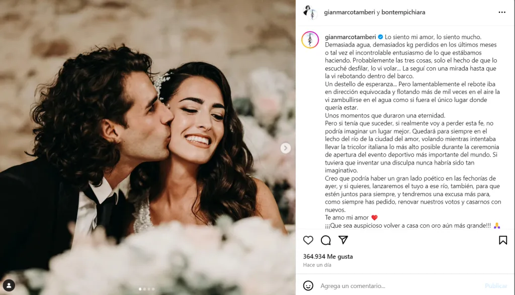 Tamberi utilizó su cuenta de Instagram y, mediante un largo mensaje casi poético, le pidió disculpas a su esposa por lo sucedido, narró cómo lo vivió estando en el barco y hasta le propuso que también tire su alianza al mismo río para que estén juntas, no sin antes pedirle que renueven los votos matrimoniales.