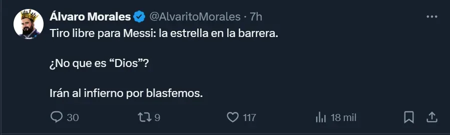 “Otro tiro libre para Messi. Lo falla”, inició en su publicación. Pero el comentarista de 44 años fue más allá: “Las piernas le tiemblan siempre ante la adversidad”, resaltó para luego despotricarlo por completo al catalogarlo como “el falso Dios”. Y si bien la temporada para Inter Miami llegó a su fin, al mejor futbolista del mundo aún le queda acción: el jueves 14 y el martes 19 de noviembre disputará sus últimos partidos del año con la Selección Argentina y por las Eliminatorias CONMEBOL.