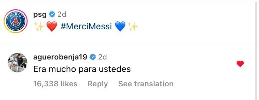 Aprovechando la pobre publicación del PSG en su cuenta de Instagram, la cual perdió casi 2 millones de seguidores desde que se fue el 10, Benjamín Agüero decidió tomar parte de las críticas hacia el club parisino: “Era mucho para ustedes”, escribió en el saludo al argentino.