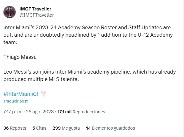 “Las actualizaciones de la plantilla y el personal de la temporada 2023-24 de la Academia de Inter Miami ya están disponibles y, sin duda, están encabezadas por una incorporación al equipo de la Academia Sub-12: Thiago Messi. El hijo de Leo Messi se une a la academia del Inter Miami, que ya ha producido múltiples talentos de la MLS“, fue la publicación que luego circuló en ESPN y en diversos medios deportivos de los Estados Unidos.