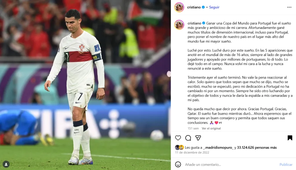 Las palabras de Cristiano Ronaldo contrastan con su post de Instagram tras el Mundial 2022, donde dijo que ganar la Copa del Mundo para Portugal era su “sueño más grande”.