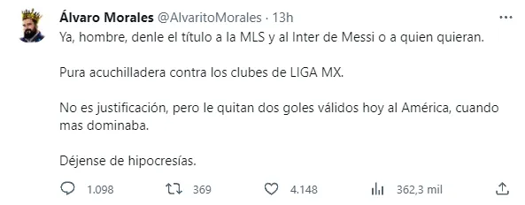 Para buscarle un razonamiento a esa derrota inesperada, que en su caso siempre escapa del plano futbolístico, Álvaro Morales volvió a apuntar a Messi. Porque sí, le sale natural. “Ya, hombre, denle el título a la MLS y al Inter de Messi o a quien quieran. Pura acuchilladera contra los clubes de LIGA MX. No es justificación, pero le quitan dos goles válidos hoy al América, cuando más dominaba. Déjense de hipocresías“, escribió desde su cuenta de Twitter buscando dar vida a una nueva teoría conspirativa, que siempre es más fácil que analizar fútbol.