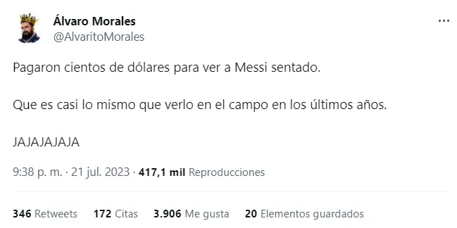 “Pagaron cientos de dólares para ver a Messi sentado. Que es casi lo mismo que verlo en el campo los últimos años. Jajaja”, escribió en su cuenta de Twitter apenas iniciado el partido. También se burló de Inter Miami y toda la MLS cuando La Máquina Cementera logró la igualdad, con La Pulga en cancha.