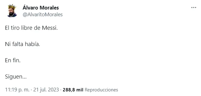Ni así, porque tampoco lo hizo una vez que la Selección Argentina se coronó campeona en Qatar, Morales desistió en sus críticas sin sentido: “Qué fácil es meterle gol al último de la Liga MX. Así hasta Messi”, escribió. Y agregó: “El tiro libre de Messi. Ni falta había. En fin. Siguen…”.