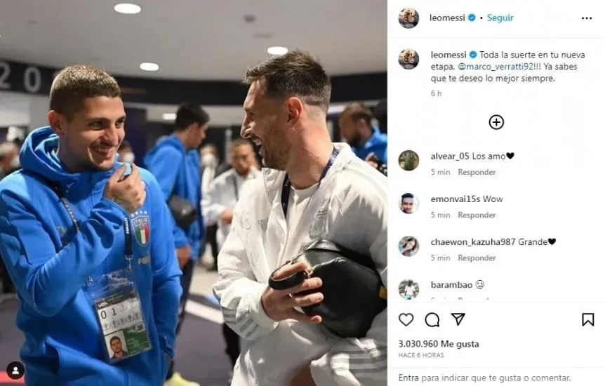 Con una foto de de la Finalissima 2022, descartó utilizar una del PSG, en donde se los ve muy felices por el momento, Messi apoyó a Marco tras las críticas que recibió y rápidamente se hizo viral con más de 3 millones de likes en solo seis horas.