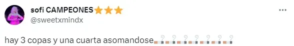 “3 copas y asoma la cuarta. Elijo creer”, “En la foto hay 3 copas y se asoma la cuarta”, fueron algunos de los mensajes de los hinchas, que ya se ilusionan con ganar el Mundial de Canadá, Estados Unidos y México, que se jugará en el 2026.