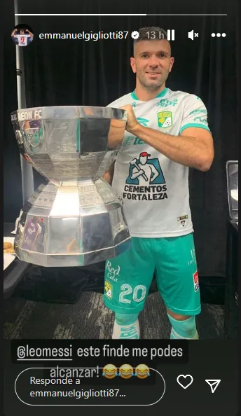 “Leo Messi, este finde me podés alcanzar”, escribió acompañando una foto en la que posa con la Leagues Cup y la camiseta de León. El delantero argentino conquistó dicho trofeo en 2021, cuando todavía no era considerado oficial por CONCACAF.