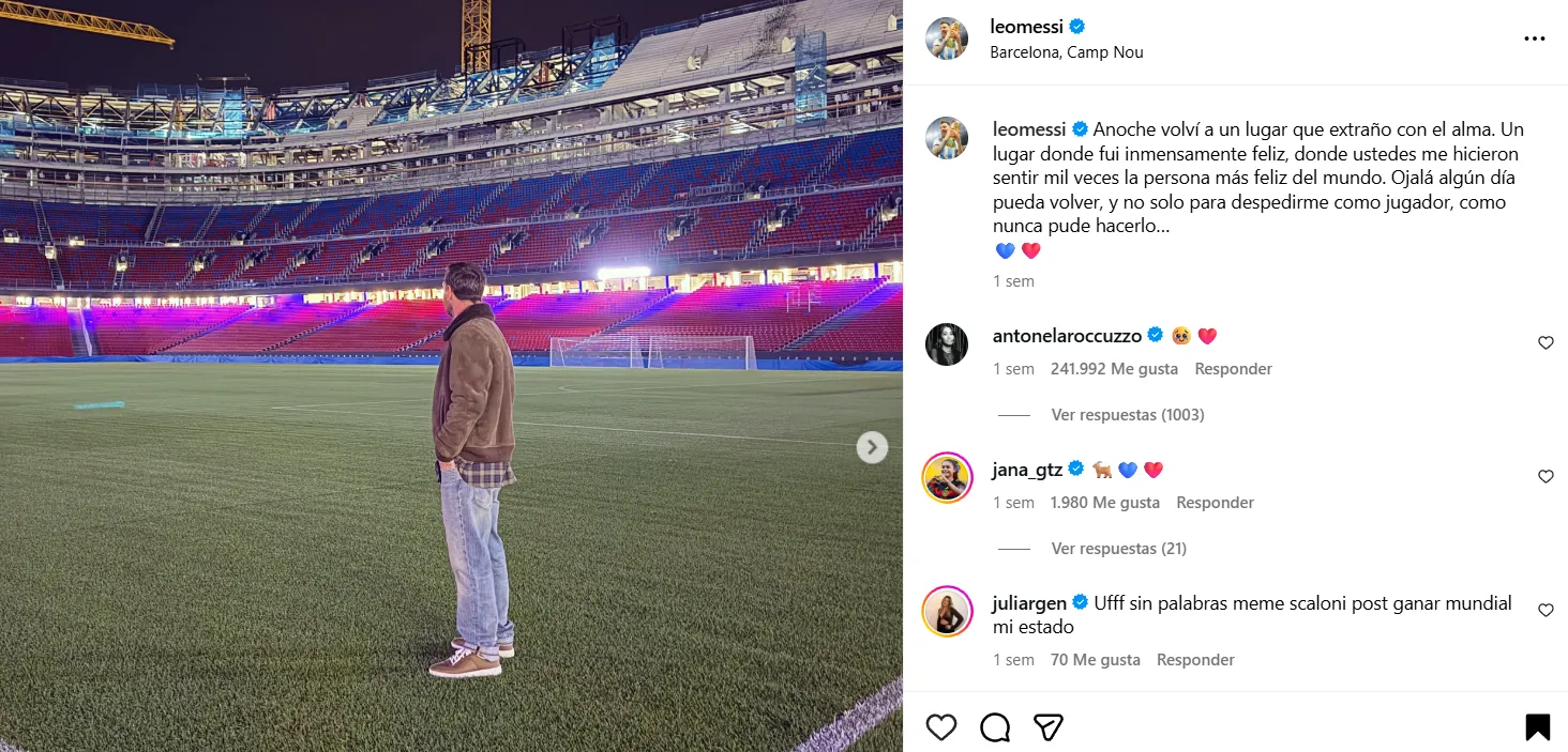 Las fotos de su reciente visita al Camp Nou que Lionel Messi publicó en sus redes sociales fueron acompañadas de un mensaje que desató la ilusión de los hinchas con verlo regresar. “Anoche volví a un lugar que extraño con el alma. Un lugar donde fui inmensamente feliz, donde ustedes me hicieron sentir mil veces la persona más feliz del mundo. Ojalá algún día pueda volver, y no solo para despedirme como jugador, como nunca pude hacerlo“, escribió.