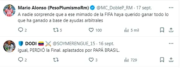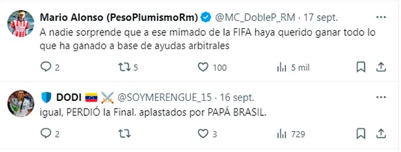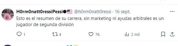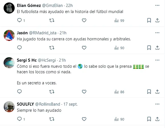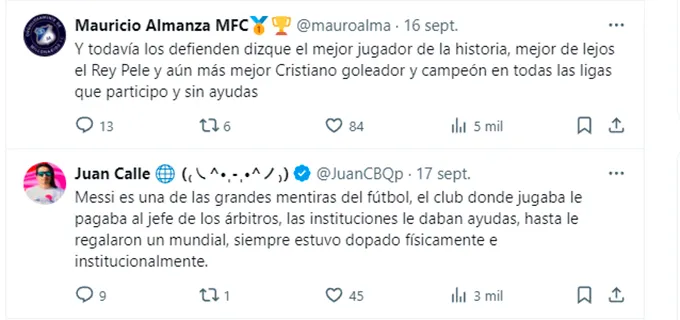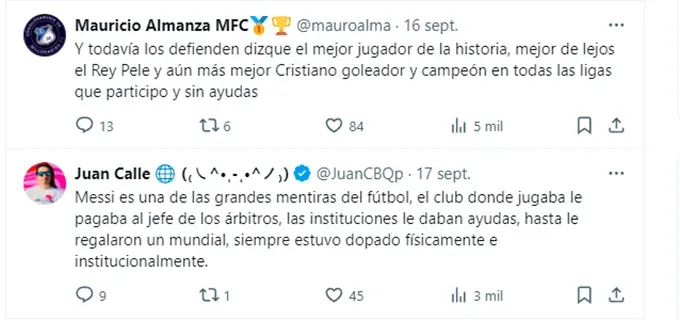“Esto es el resumen de su carrera. Sin marketing ni ayudas arbitrales es un jugador de Segunda División”, comentó un fanático de lo más exagerado. “Y todavía lo defienden y dicen que es el mejor de la historia. El mejor, lejos el Rey Pelé. Y aún más mejor Cristiano goleador y campeón de todas las ligas”, señaló otro. “Messi es una de las grandes mentiras del fútbol, el club donde jugaba le pagaba al jefe de los árbitros, las instituciones le daban ayudas, hasta le regalaron un Mundial, siempre estuvo dopado físicamente e institucionalmente”, denunció un tercero. “A nadie sorprende que a ese mimado de la FIFA haya querido ganar todo lo que ha ganado a base de ayudas arbitrales”, advirtió uno más.