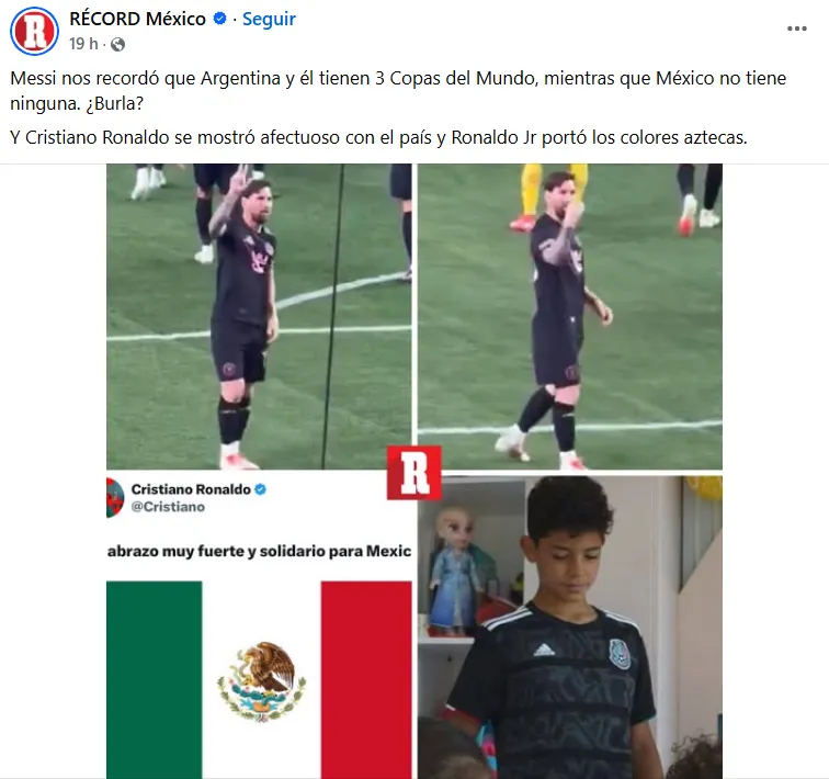 Asimismo, RÉCORD, el periódico más leído de país en cuestión, también colaboró para la campaña que tiene como único motivo ir en contra del capitán de la Selección Argentina y a favor del portugués. ”Messi nos recordó que Argentina y él tienen 3 Copas del Mundo, mientras que México no tiene ninguna. ¿Burla? Y Cristiano Ronaldo se mostró afectuoso con el país y Ronaldo Jr portó los colores aztecas”.