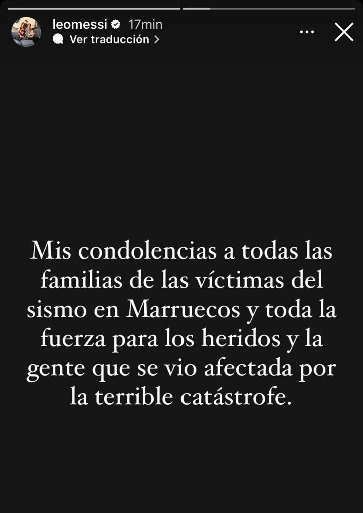 “Mis condolencias a todas las familias de las víctimas del sismo en Marruecos y toda la fuerza para los heridos y la gente que se vio afectada por la terrible catástrofe”, expresó Messi. Sí, el capitán está en todas y no deja nada librado al azar. ¡Sos enorme, Pulga!