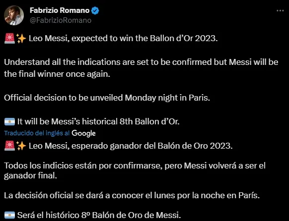 Una disputa en la que todos los especialistas colocaron a Messi como el favorito para la coronación que se terminaría dando según lo que confirmó Fabrizio Romano: “Todos los indicios están por confirmarse, pero Messi volverá a ser el ganador final”, según escribió en su cuenta de Twitter.