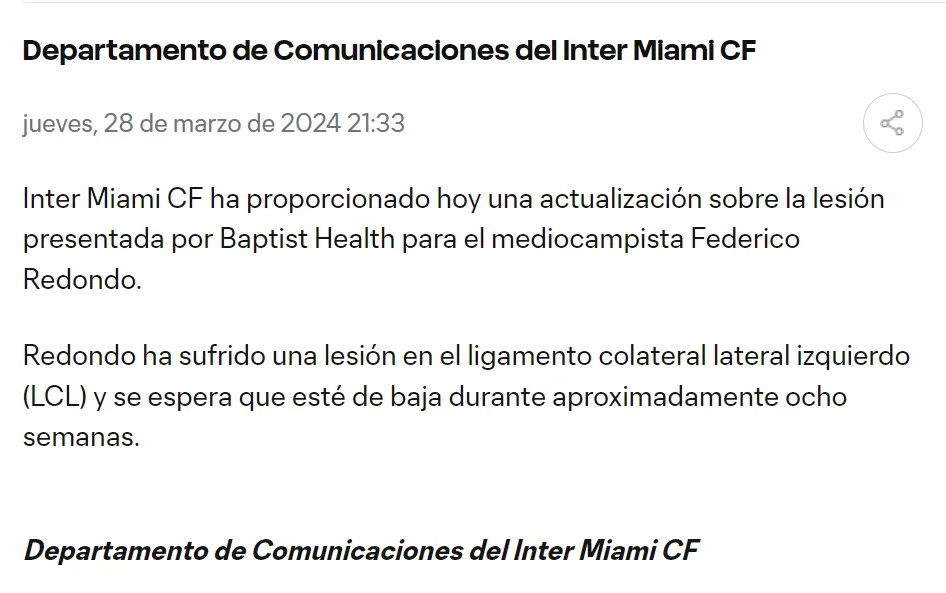El mediocampista argentino, según notificó el Departamento Médico de Inter Miami, padeció una lesión en el ligamento colateral lateral izquierdo, y tendrá que ser relegado por los próximos dos meses. De esta manera, recién podría retornar a las canchas a fines del mes de mayo. Y a Gerardo Martino le genera un enorme dolor de cabeza.