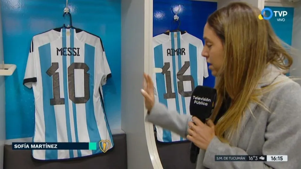 En la visita a uno de los vestidores, fue prácticamente inevitable ir directamente a buscar el asiento que ocupará Messi para luego cambiarse antes de salir a la cancha. Además de confirmar que Pablo Aimar, su ídolo, se sentará junto a él en el vestuario, Sofía Martínez también dio a conocer la camiseta que usará Leo en el partido despedida de Riquelme para terminar con todo el misterio.