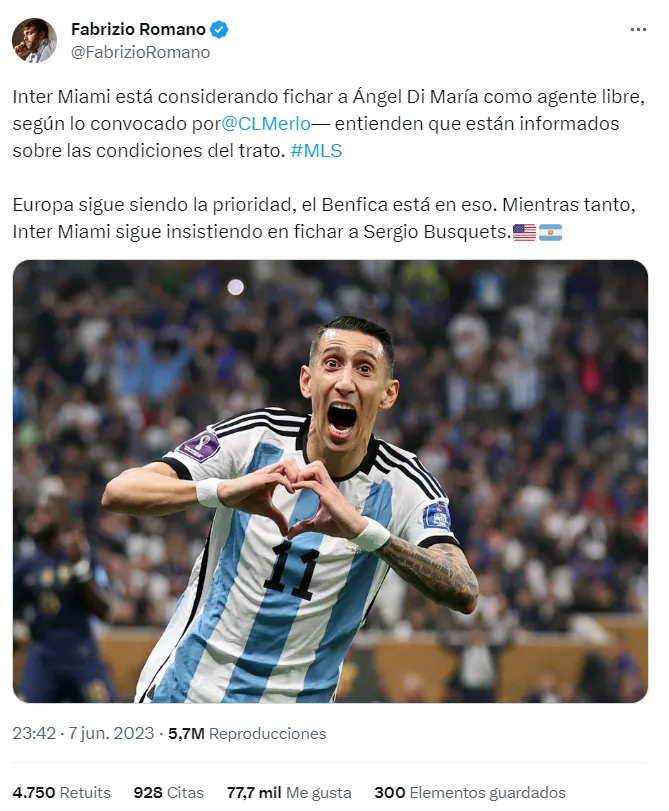 “Inter Miami está considerando fichar a Ángel Di María como agente libre, según lo convocado por César Luis Merlo (periodista argentino). Entienden que están informados sobre las condiciones del trato”, informó, aunque aclaró que “Europa sigue siendo la prioridad”.