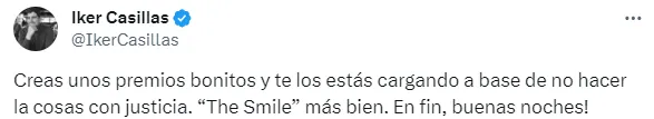 ”Creas unos premios bonitos y te los estás cargando a base de no hacer la cosas con justicia. “The Smile” más bien. En fin, buenas noches!”, escribió quien, en definitiva, es el segundo guardameta al que más tantos le anotó Lionel Messi a lo largo de su carrera (le marcó 18 goles y comparte posición junto a Gorka Iraizoz, ambos por debajo de Diego Alves que recibió 21 tantos).