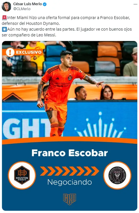 Pero podría haber más noticias en cuanto a refuerzos en las últimas horas. Es que César Luis Merlo, el peridiodista especializado en transferencias, adelantó que Inter Miami lanzó una oferta formal por Franco Escobar, cuyo pase pertenece a Houston Dynamo, también de la MLS.