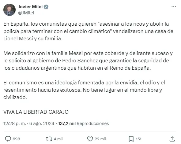 “En España, los comunistas que quieren ‘asesinar a los ricos y abolir la policía para terminar con el cambio climático’ vandalizaron una casa de Lionel Messi y su familia“, comenzó escribiendo el jefe de Estado en ‘X’, donde cuenta con más de 3 millones de seguidores.