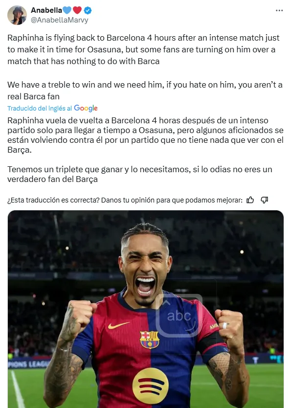 Por su parte, Anabella Marvy, reconocida hincha del Barcelona en redes, se inclinó más hacia el lado del brasilero: ”Raphinha vuela de vuelta a Barcelona 4 horas después de un intenso partido solo para llegar a tiempo a Osasuna, pero algunos aficionados se están volviendo contra él por un partido que no tiene nada que ver con el Barça. Tenemos un triplete que ganar y lo necesitamos, si lo odias no eres un verdadero fan del Barça”.
