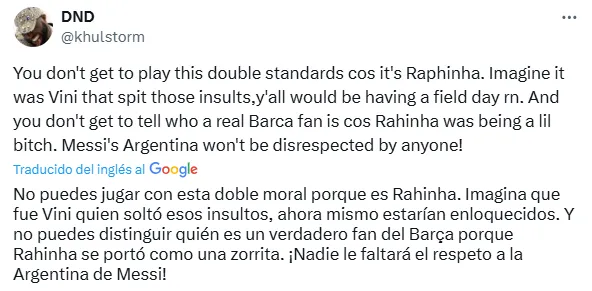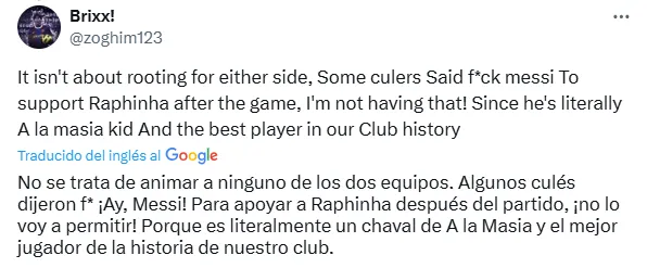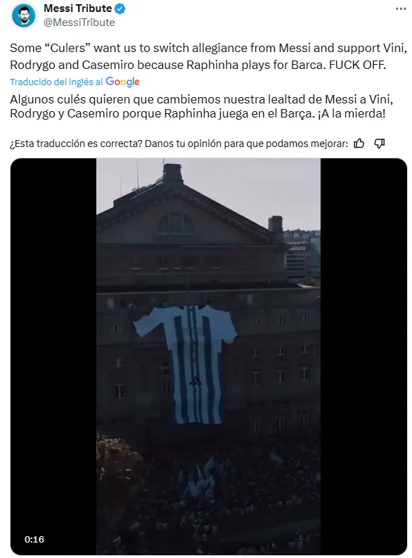 ”Algunos culés quieren que cambiemos nuestra lealtad de Messi a Vini, Rodrygo y Casemiro porque Raphinha juega en el Barça. ¡A la mierda!”, escribió @MessiTribute cuenta de la red sociales X (ex Twitter) que está dedicada tanto a Lionel Messi como al día a día del Barcelona.
