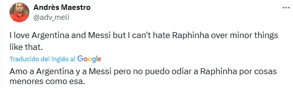 Al respecto, @adv_meli comentó: ”Amo a Argentina y a Messi pero no puedo odiar a Raphinha por cosas menores como esa”.