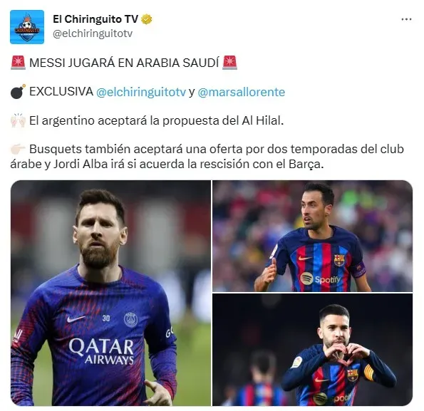 El club en cuestión, según adelantaron en El Chiringuito vía Twitch, es el Al-Hilal, institución que puso un contrato de 300 millones de euros al año sobre la mesa. Y Leo no se iría solo, porque también se menciona la chance de que Jordi Alba y Sergio Busquets aterricen junto a la Pulga en el fútbol árabe a partir de la temporada 2023/24. Serían terribles noticias para los hinchas del FC Barcelona que no solo soñaban con la vuelta de Messi, sino con la continuidad de dos de sus ídolos. Shock en el ámbito deportivo a estas horas.