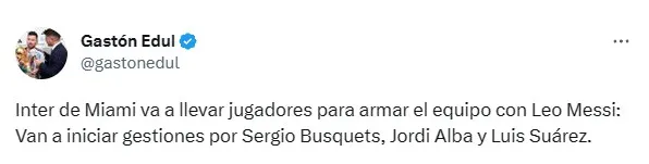 Gastón Edul informó que el Inter Miami sueña con la contratación de tres excompañeros de Messi en el FC Barcelona: Luis Suárez, Jordi Alba y Sergio Busquets, con quienes levantó su última UEFA Champions League en 2015. El volante y el lateral quedaron libres del Blaugrana y todavía se desconoce sus siguientes destinos, mientras que el Pistolero tiene contrato en Gremio hasta diciembre de 2024, por lo que habría que negociar entre clubes para conseguir la liberación de su ficha. Se arma la “órbita Messi”.