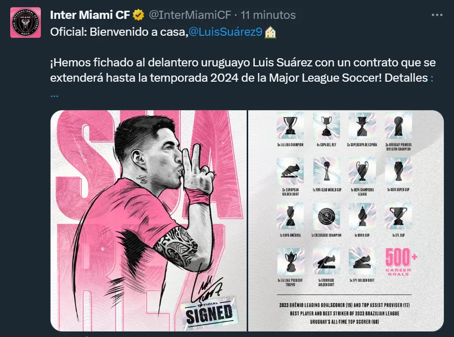 En medio de la presentación oficial, en el sitio oficial de Inter Miami destacaron que Luis Suárez “se unirá al equipo de cara a la temporada 2024 de la MLS luego de ser nombrado Mejor Jugador y Mejor Delantero de la liga brasileña gracias a sus 26 goles y 17 asistencias en 53 apariciones, y llevar al Grêmio a ganar el Campeonato Gaúcho y la Recopa Gaúcha”. La felicidad es total.