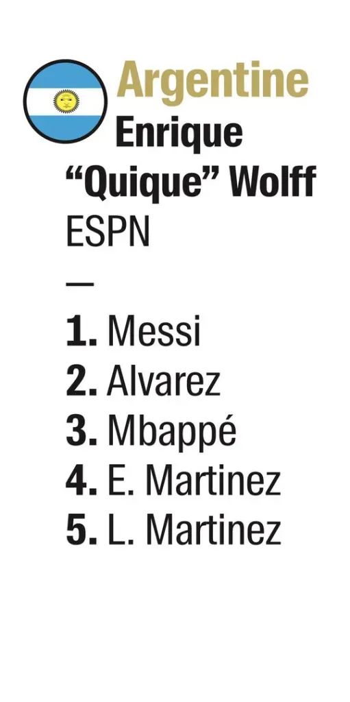 El periodista de ESPN fue el encargado de votar en nombre de Argentina y lo hizo con mucha fidelidad a la Selección. El 1° fue para Messi, el 2° para Julián Álvarez, el 3° para Mbappé (el único extranjero), el 4° para Emiliano Martínez y el restante para Lautaro. ¿Haaland? No figuró.